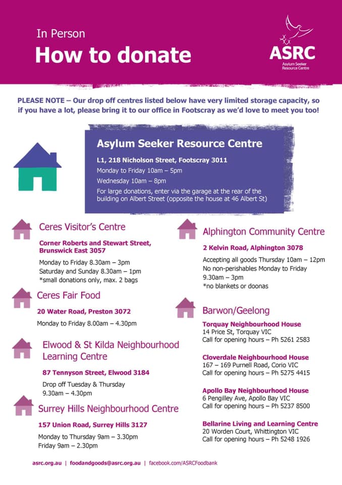 If you can’t get to Footscray, you can still donate food to help people seeking asylum. You can shop online, and Coles will deliver your donation to us FREE of charge (for orders $50 and over). We also have a number of drop-off points around Melbourne listed on the attached flyer. Please note that these places have limited storage capacity and can usually only accept small donations.